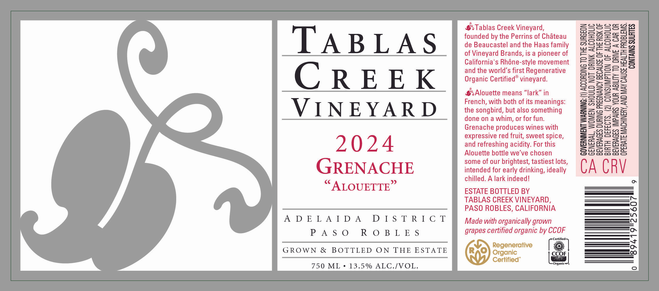 “Alouette” is the name given to a potential trend setting Grenache made by Tablas Creek Vineyards. The back label says it is “intended for early drinking, ideally served chilled.” The name “Alouette” which is the French name for a lark was chosen for this wine because it conveys a sense of fun. (For more about the word “Alouette,” see my note at the end.)